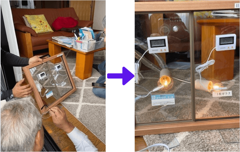 複層ガラスの最先端技術を取り入れた断熱効果がすごいと言われている真空ガラスの実験をご紹介します。弊社がガラス交換注文を頂いたお客様のご自宅で実験を行った写真です。